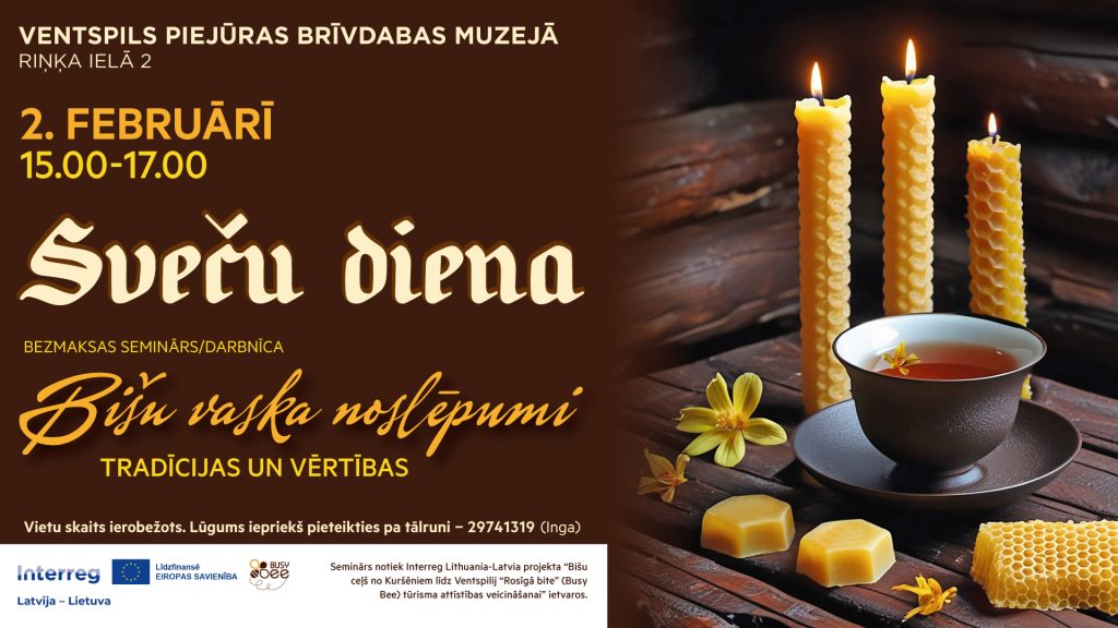 2. februārī no plkst. 15.00-17.00 Piejūras brīvdabas muzejs svinēs Sveču dienu, kuras ietvaros norisināsies seminārs-darbnīca “Bišu vaska noslēpumi”. Pasākumu vadīs muzeja pedagoģe Inga Uhaņa un vēsturniece Dace Kamela – iepazīstinās dalībniekus ar Sveču dienas nozīmi latviešu tautas ticējumos un ikdienas dzīvē, kā arī atklās bišu vaska īpašo vietu tradicionālajā kultūrā.