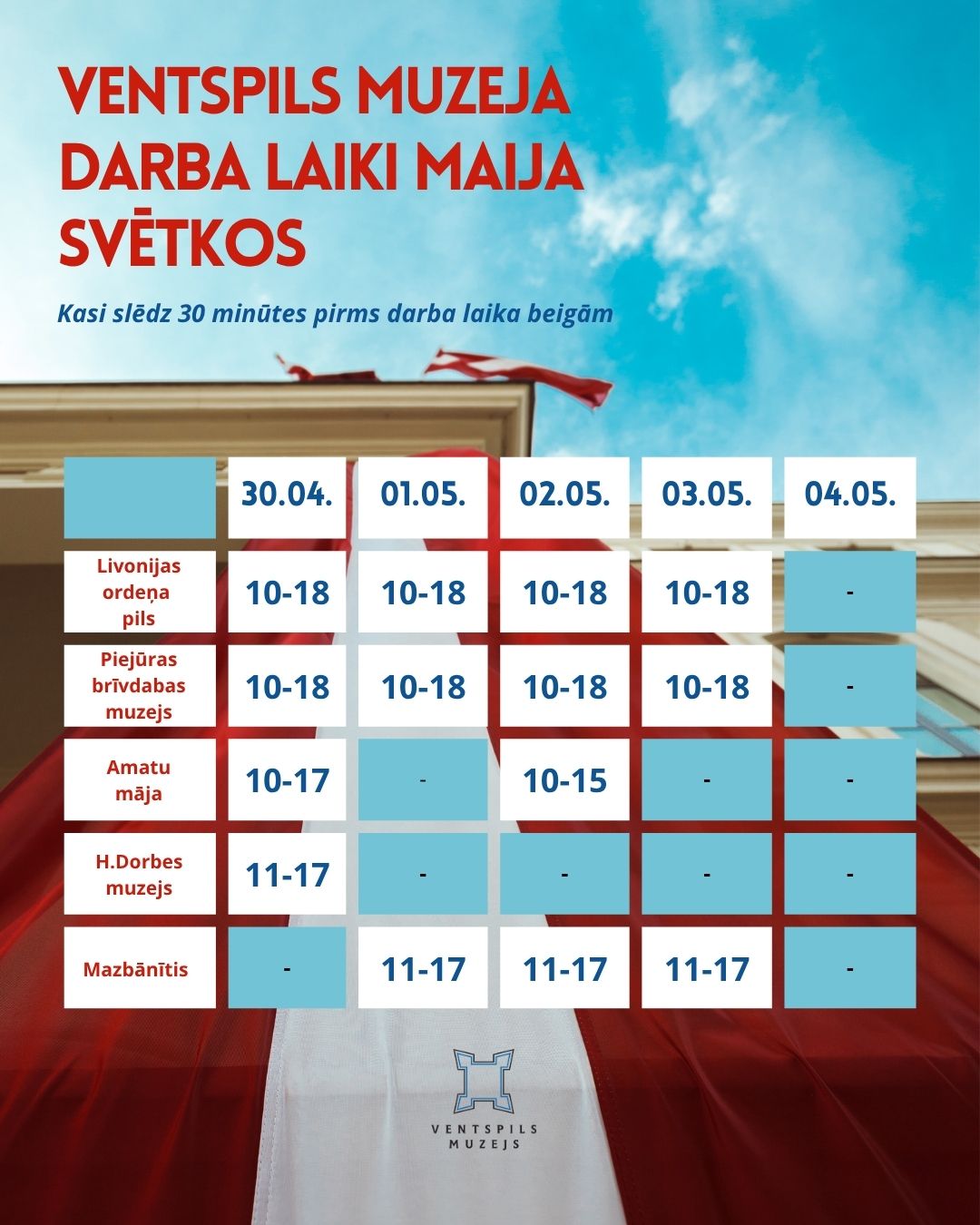 Maija svētku brīvdienās Ventspils muzejs aicina pilsētas viesus un ventspilniekus izbaudīt pavasara noskaņu – īpaši aicinām apmeklēt Piejūras brīvdabas muzeja sezonas atklāšanu 1. maijā ar Mazbānīti un radošajām darbnīcām, savukārt Livonijas ordeņa pilī – apmeklēt Medību trofeju izstādi “Ventspils 2026” (līdz 7.maijam!), bet Amatu māja piedāvā izstādi “Ceļojums”.